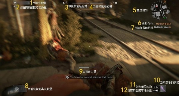12:金属零件可在场景中收集,它们用来维修损坏的武器。在武器轮盘或道具栏里能看到武器的耐久度和磨损。